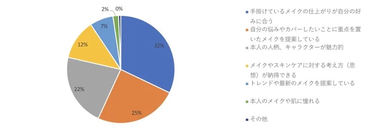 実際に「参考にするメイクアップアーティストの最大の決め手」についての質問では、「手掛けているメイクの仕上がりが自分の好みに合う」「自分の悩みやカバーしたいことに重点を置いたメイクを提案している」といった「メイクの工程や完成度」を重視する意見が多く集まりました。