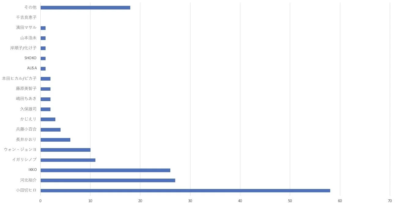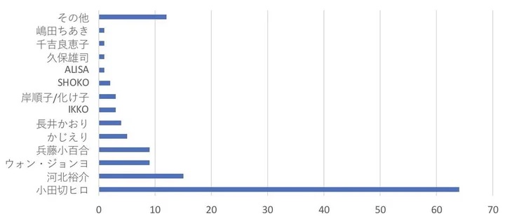 ヤング世代においても、上位は前回と変わらない3名となりました。他のアーティストに比べ小田切ヒロさんへの支持が厚いことも、前回から続くヤング世代の特徴です。
