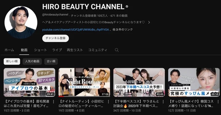 小田切ヒロさんのYouTubeチャンネルの主な投稿内容はメイクの実演やコスメの紹介で、じっくりと時間をかけた30分程度の動画がメインです。反対にTikTokでは、インパクトのあるナレーションが特徴の60秒程のショート動画を、Instagramではお仕事の写真を中心にし、動画投稿はインスタライブのアーカイブ(録画)やプロモーション動画を掲載する程度にとどめられています。(動画の内容は2023年11月時点)