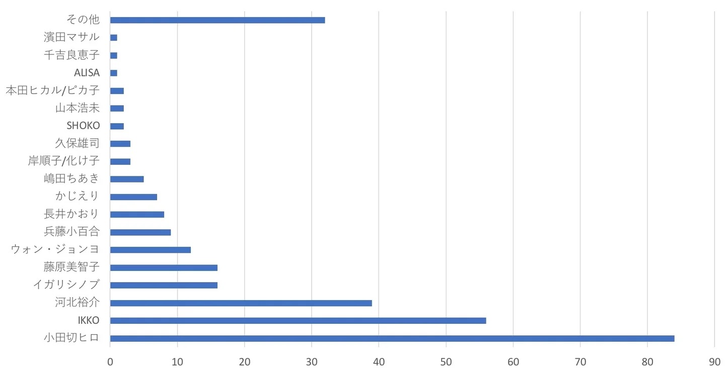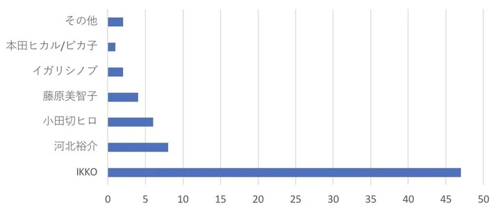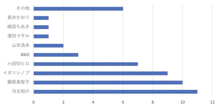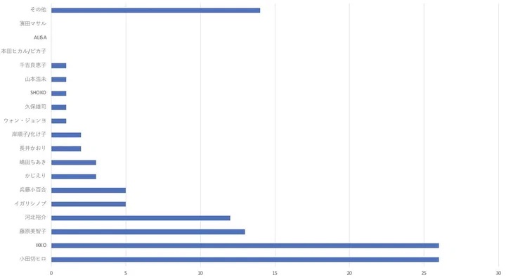 上位は小田切ヒロさん、IKKOさん、河北裕介さんの3名がランクインしています。この順位は前回と変わりませんが、1位の小田切ヒロさんは前回の67票からさらに20票近くを増やし、支持を拡大しています。